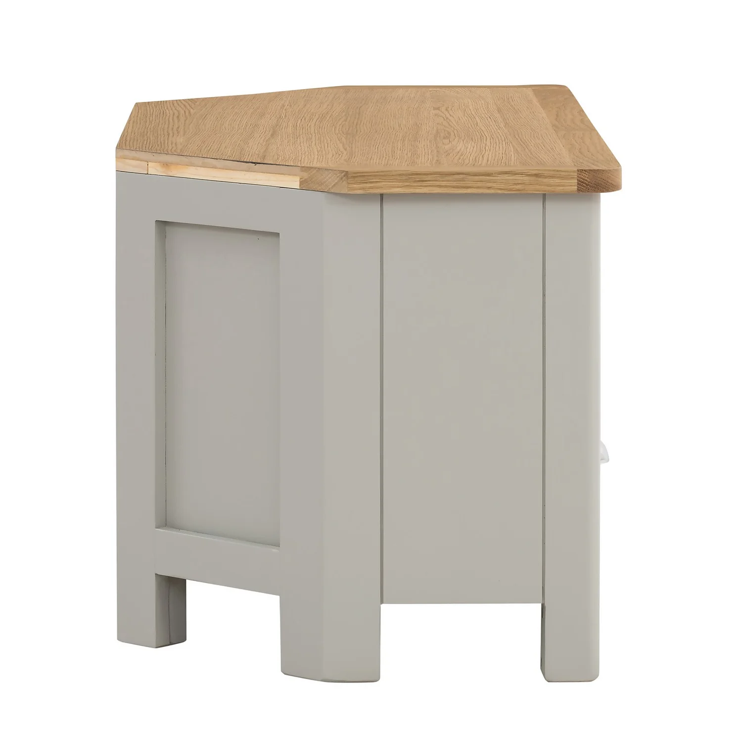 We’ve worked hard to make Norbury our most family-friendly range yet. We’ve softened all the edges, even the legs, so there are no sharp corners here. This compact collection has a small footprint, but its clever design doesn’t compromise on storage space. Meet our grey Norbury corner TV stand. It features charming timeless details such as the classic oak top, cup handles but with a modern painted grey finish. The 2 drawers will take care of any media clutter, whilst the open shelf can hold your home entertainment box. The design fits neatly in the corner of your lounge to make the most of your precious space.